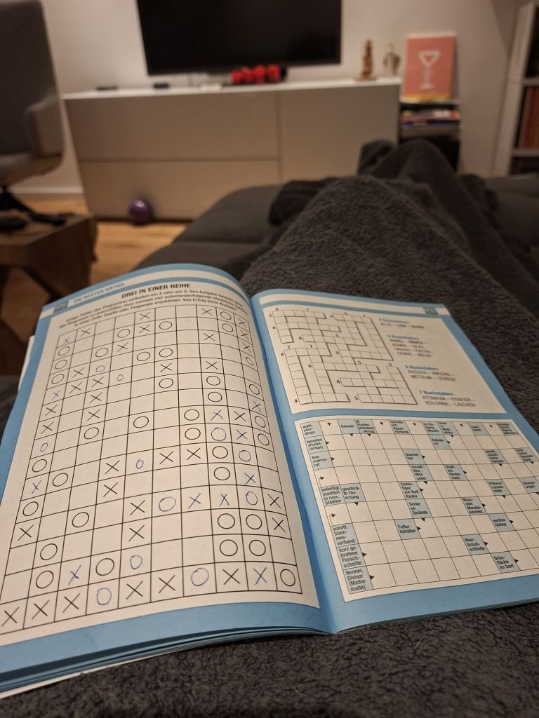 Im Urlaub habe ich das Rätseln wieder entdeckt. Statt fernsehen, löse ich noch ein, zwei Rätsel und dann geht es auch schon ins Bett.