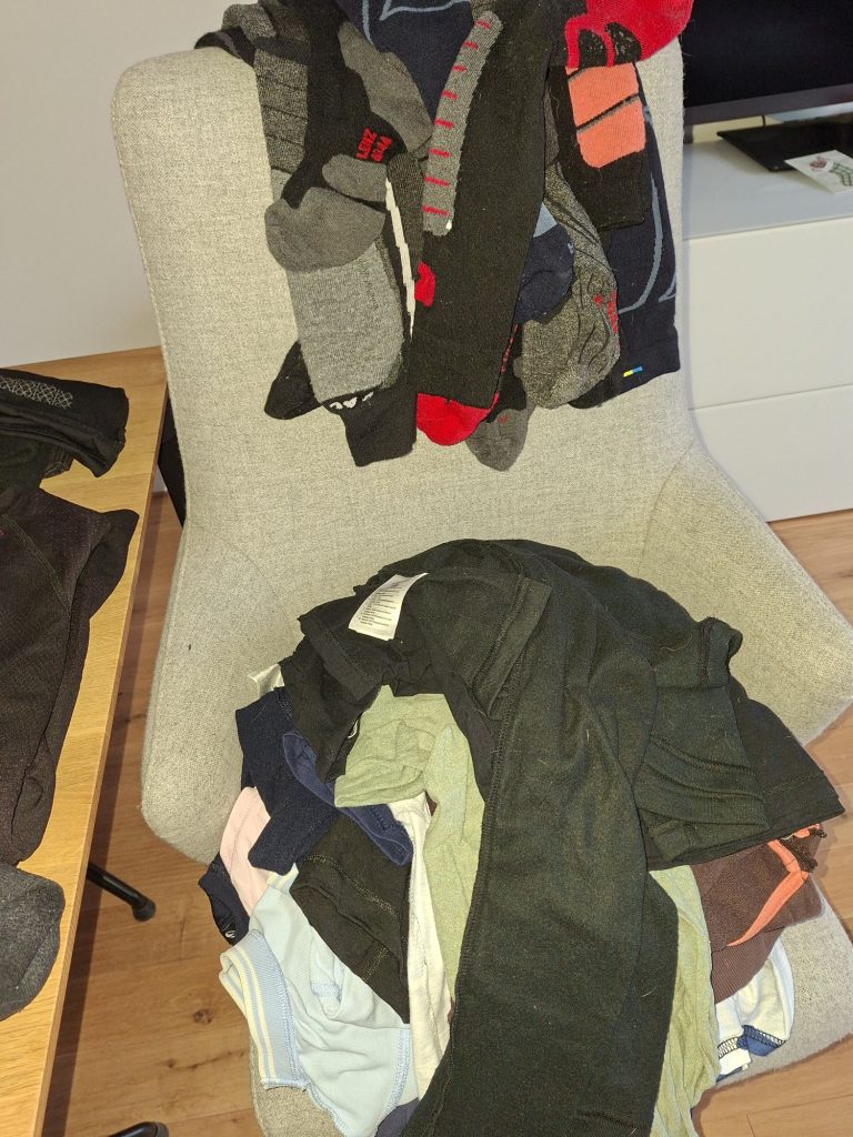 Die Wäsche aus dem Urlaub ist noch nicht komplett erledigt, also lege ich die nächsten Sachen, die getrocknet sind, zusammen.